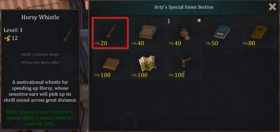 I would highly suggest one of the first items you get from Arty's Special Items Section Arty’s Library of Great Achievements’ Special Items Section would be the Horsy Whistle as for the low investment of 20 Old Artifacts, 'Horsy' will return to you 20% quicker which is quite an improvement when farming. Arty also sells Skillbook: Summon Horsy but this should be a low priority as if you accidentally dismiss 'Horsy' you can always pick him up at one of the various stables around the world.